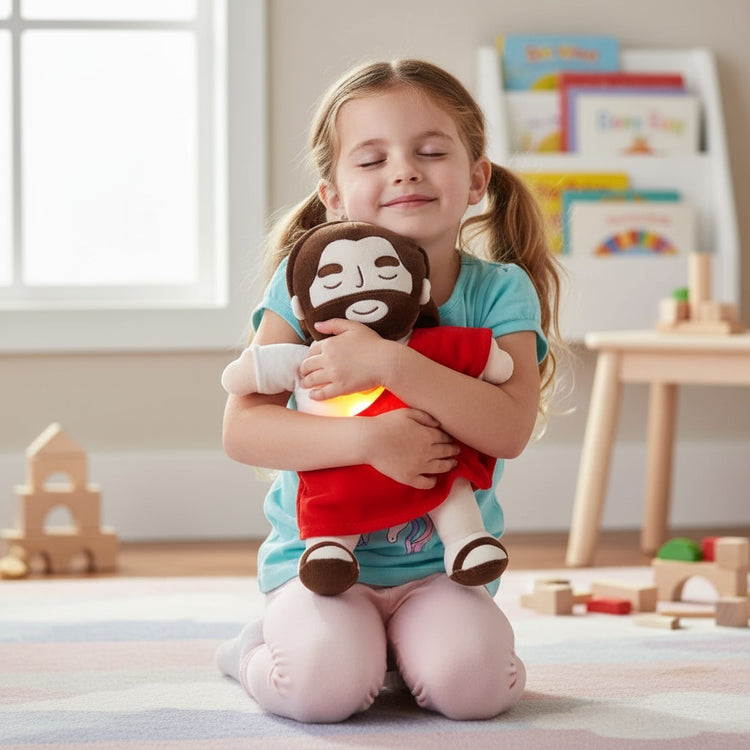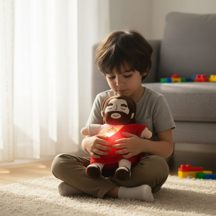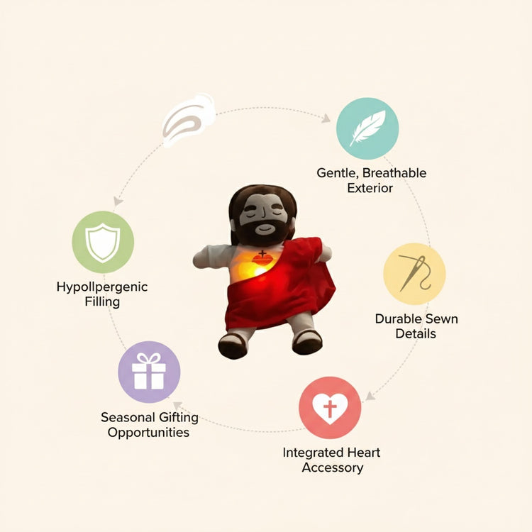The Jesus SoulHug measures about 40 cm (around 11.75 inches) in height, the perfect size for cuddles, prayer time, or peaceful rest.